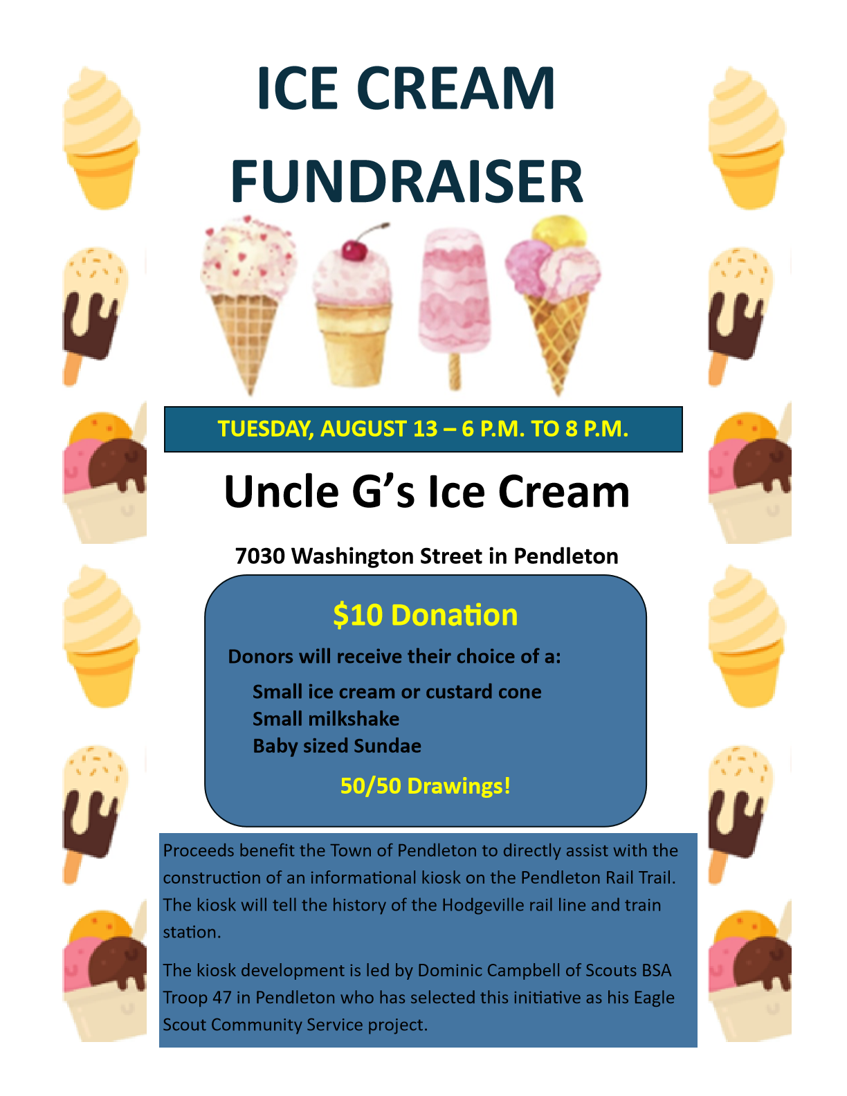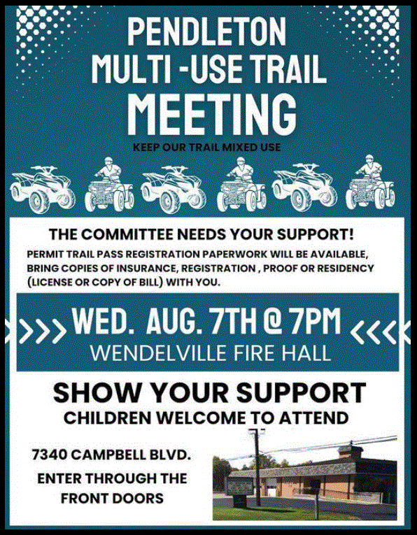 Pendleton ATV Committee Meeting Anyone interested in joining the ATV Committee is invited to attend a meeting on Wednesday, August 7th at 7:00 p.m. at Wendelville Fire Hall. |