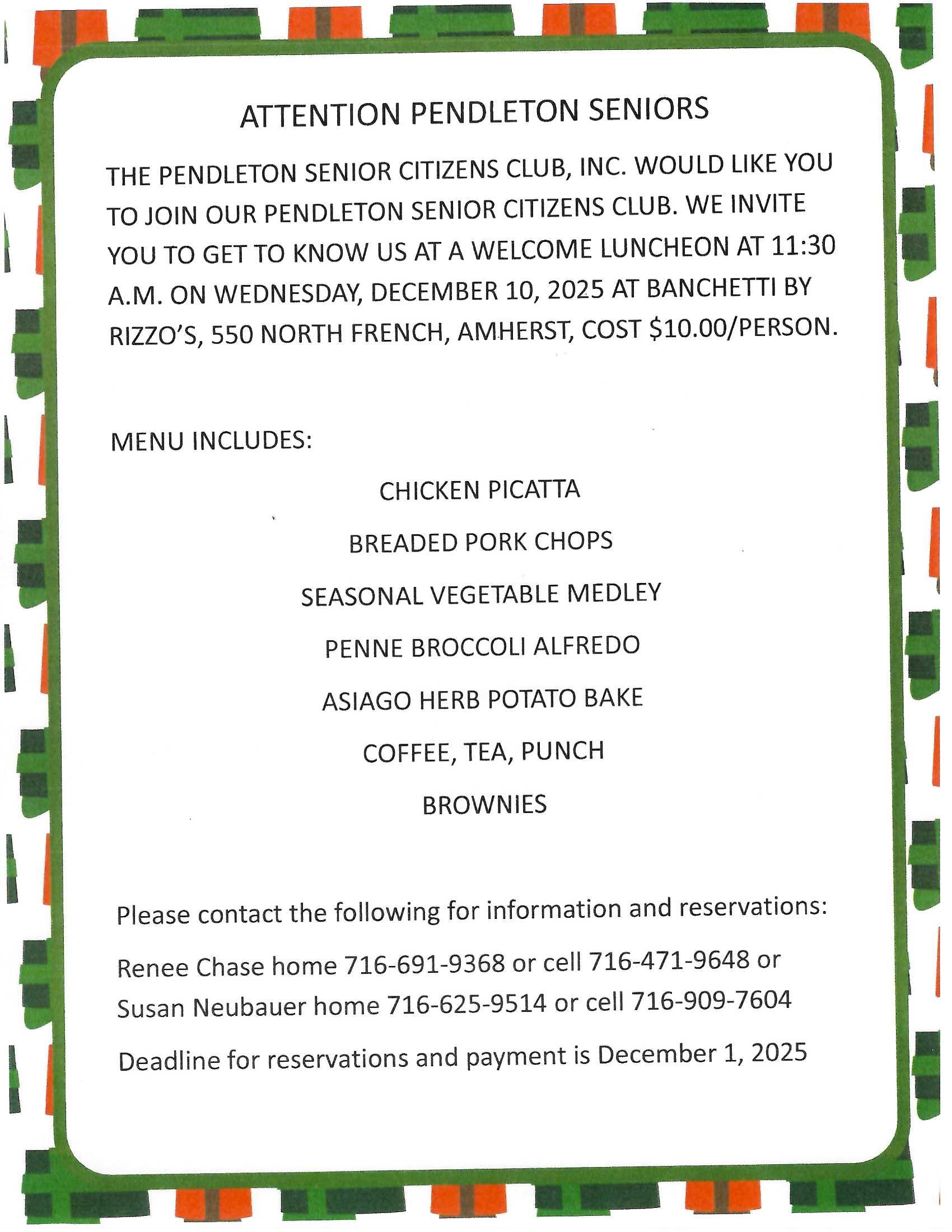 The Pendleton Senior Citizens Club, Inc. would like you to join our Pendleton Senior Citizens Club. We invite you to get to know us at a WELCOME LUNCHEON at 11:30 AM on Wednesday, December 10th. The cost is $10.00/person. See PSCC Luncheon Flyer for menu and additional information. Please RSVP by December 1, 2025 Renee […] |